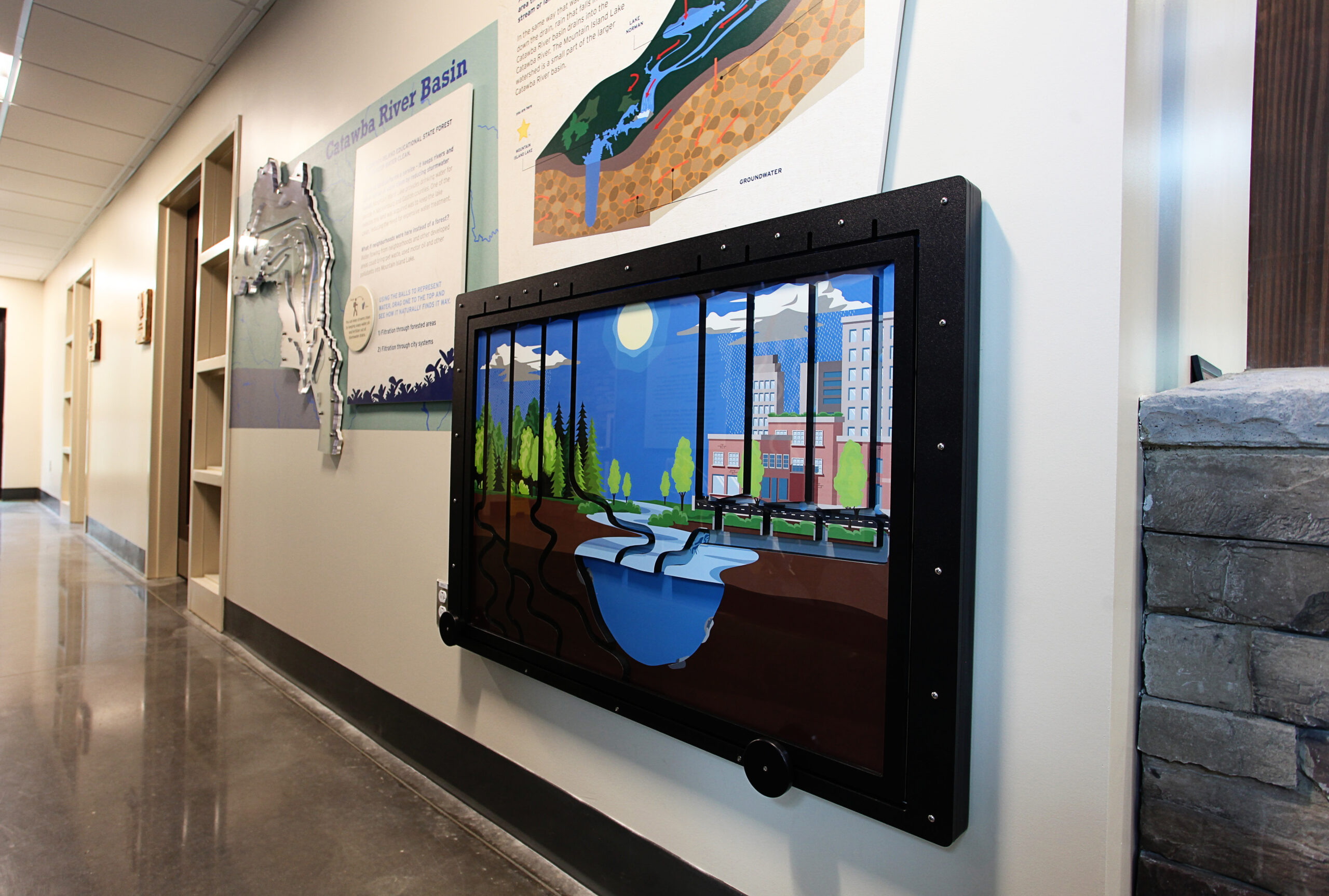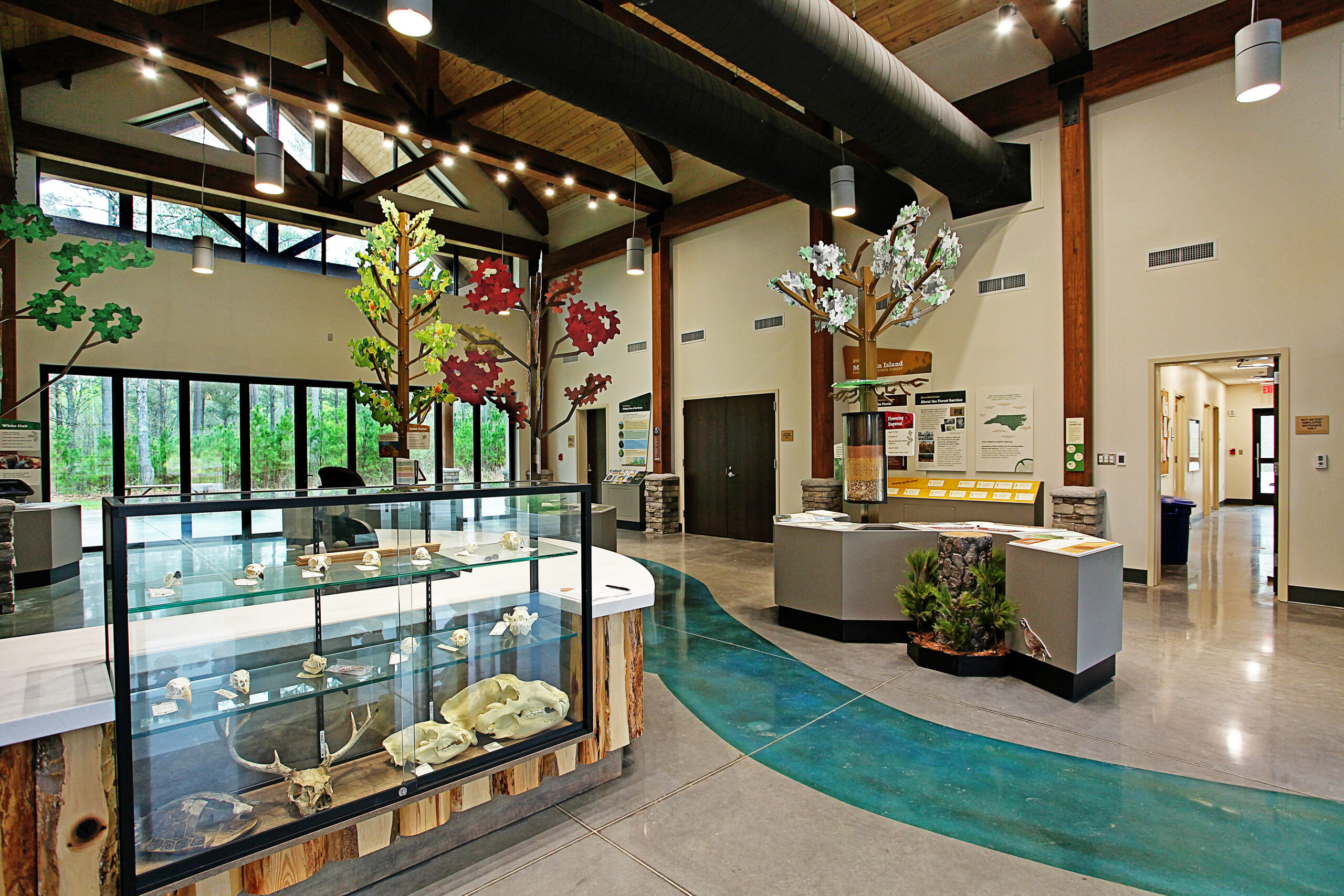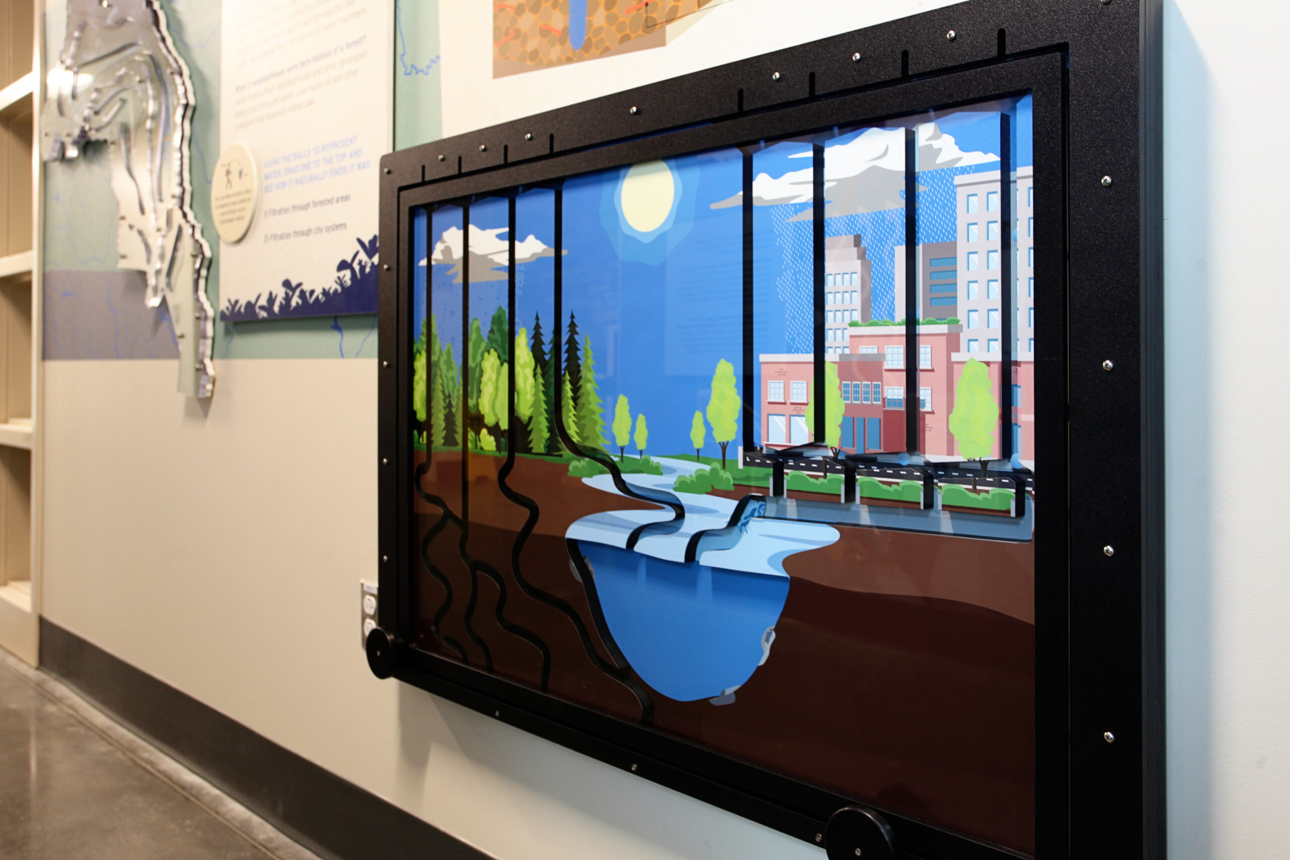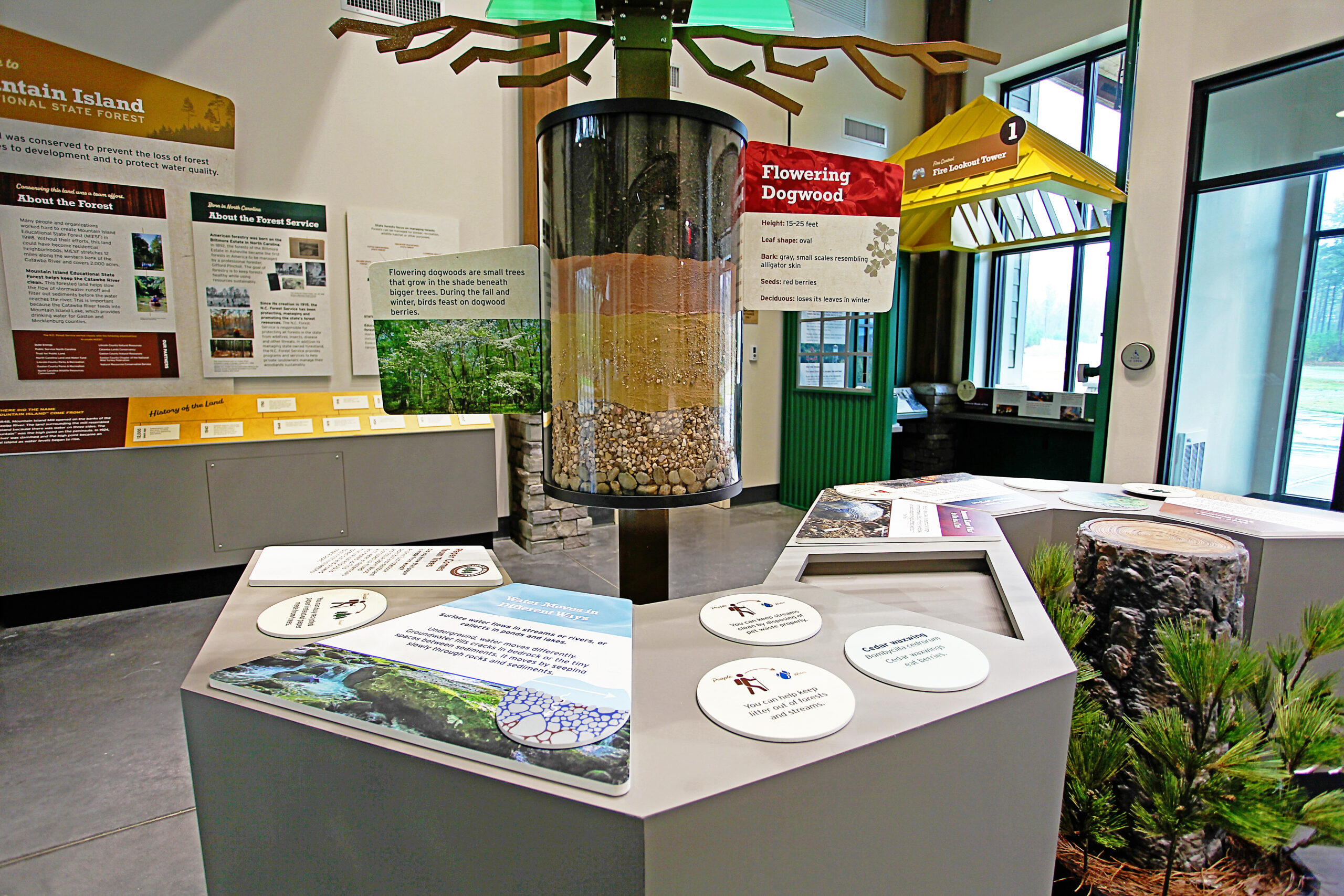 Studio Displays partnered with the forest to enhance educational exhibits, providing interactive visuals such as a fire tower for firefighting education, abstract representations of local trees, and graphic visuals explaining the habitat. We also fabricated scenic elements to illustrate the water purification process, enriching the visitor experience and deepening their understanding of the forest’s ecosystems.